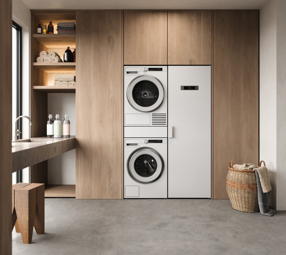 Она состоит из стиральной машины, сушильной машины, сушильного шкафа и аксессуаров Hidden Helpers™.